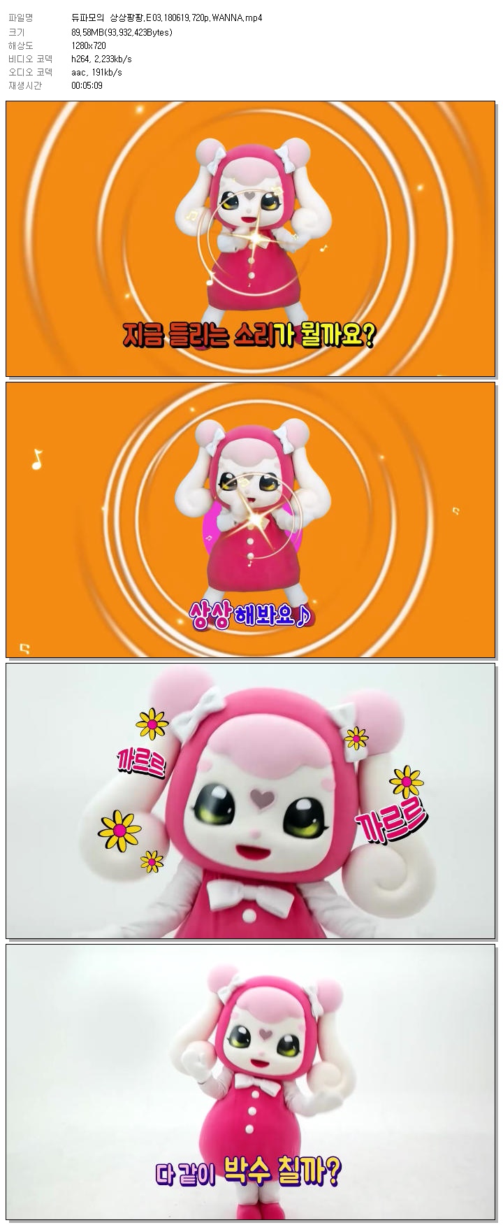 | 듀파모의 상상팡팡.E03.180619.720p.WANNA.mp4 | 89.6 M | 00:05:09 | 1280x720 |