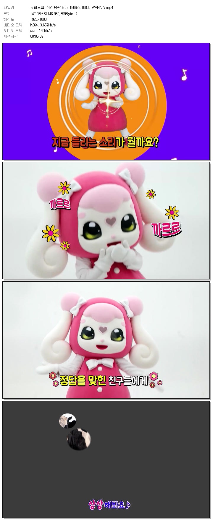 | 듀파모의 상상팡팡.E06.180626.1080p.WANNA.mp4 | 142.1 M | 00:05:09 | 1920x1080 |