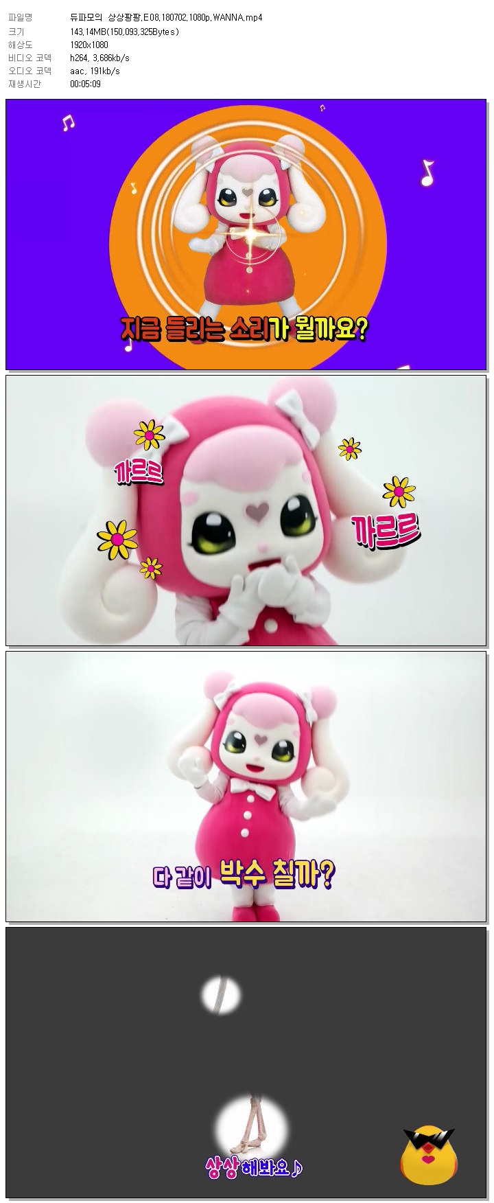 | 듀파모의 상상팡팡.E08.180702.1080p.WANNA.mp4 | 143.1 M | 00:05:09 | 1920x1080 |