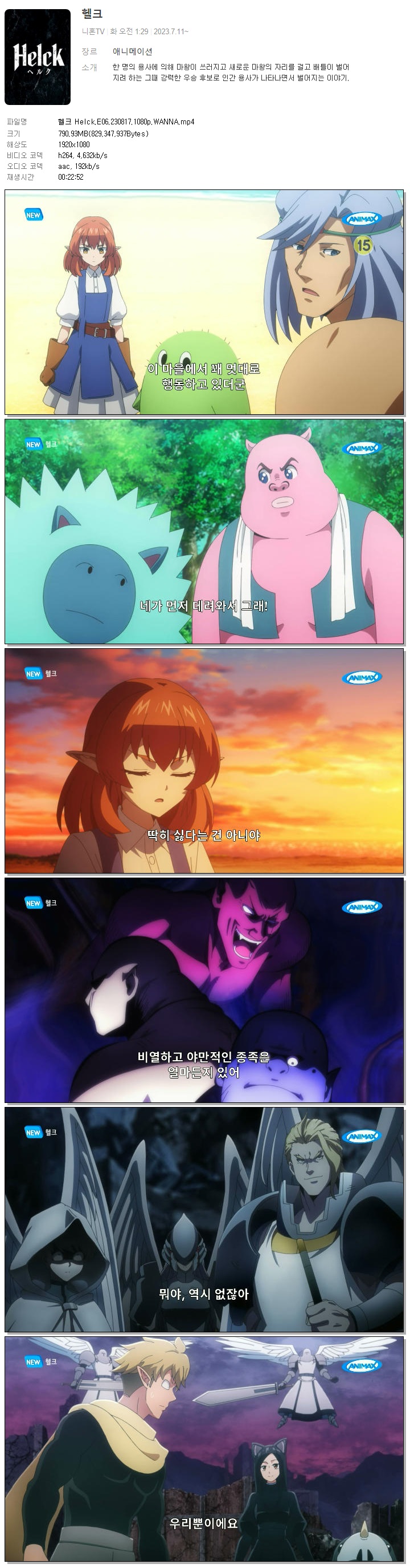 | 헬크 Helck.E06.230817.1080p.WANNA.mp4 | 790.9 M | 00:22:52 | 1920x1080 |
