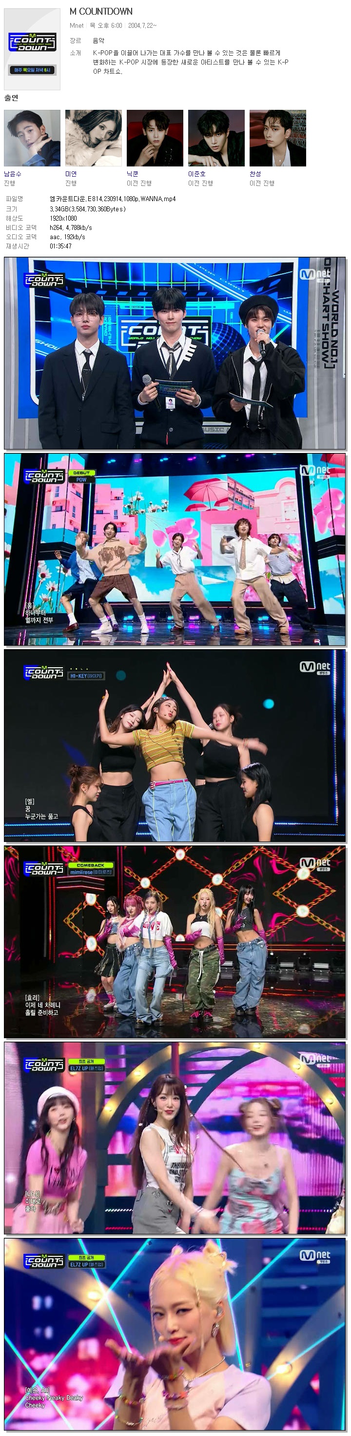 | 엠카운트다운.E814.230914.1080p.WANNA.mp4 | 3.3 G | 01:35:47 | 1920x1080 |