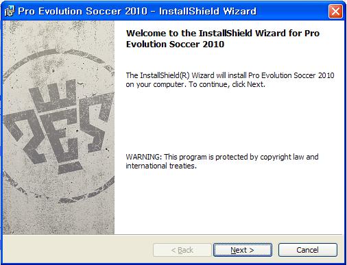 위의 과정을 끝내셨으면 내 컴퓨터에 들어가십시오. 전에 없던 PES2010이라는 CD 드라이브가 보일 겁니다. 더블클릭하셔서 열면 여러가지 파일들이 보이실 겁니다. 그중 Pro Evolution Soccer 2010라는 설치파일을 더블클릭하시면 아래와 같은 설치창이 뜰겁니다.