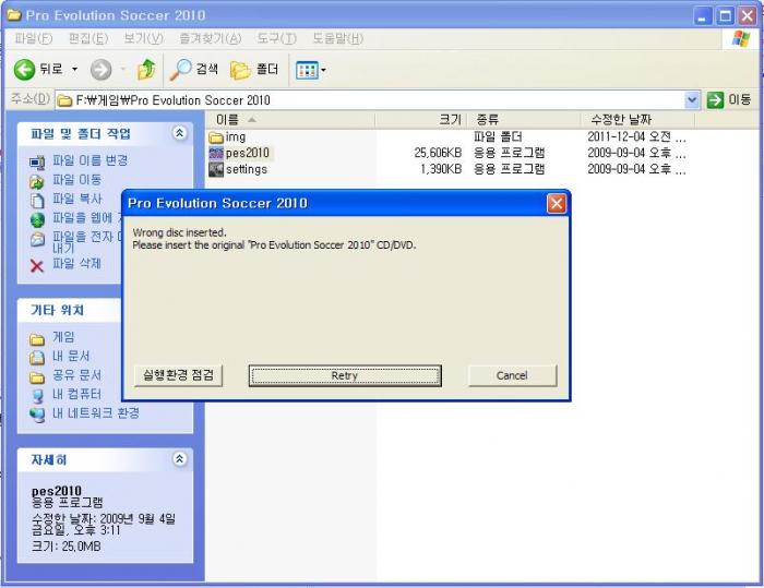 설치가 완료되면 InstallShield Wizzard Completed 라고 뜨면서 성공적으로 설치했다고 뜹니다. Finish 버튼 눌러서 설치 끝내시면 됩니다. 그러나 아직 문제가 남았습니다. 님이 위닝을 설치한 폴더에 들어가서 pes2010라는 게임시작 버튼을 누르면 아래와 같은 실행오류창이 뜨며 잘못된 디스크를 삽입했다고 뜹니다.