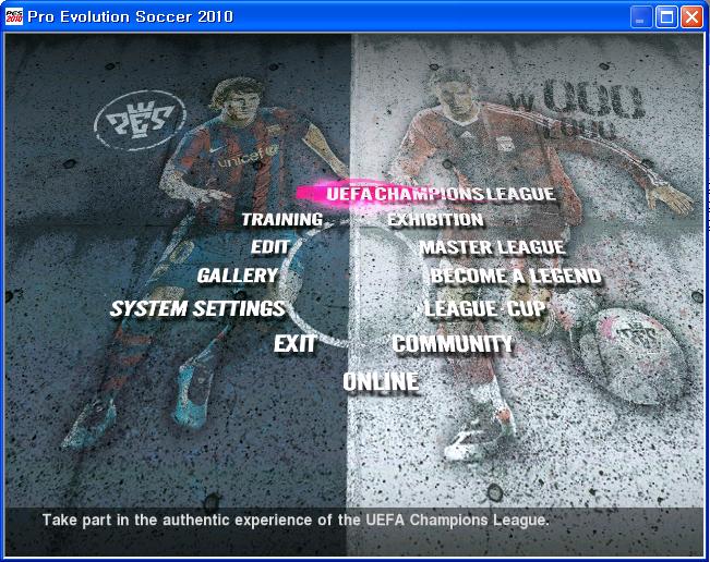 위와 같이 덮어쓰기를 하신 다음 다시한번 님이 게임 설치한 폴더에 있는 pes2010 파일을 실행시키면 정상적으로 게임 시작됩니다. 만약 Warning이라고 뜨며 중단, 다시 시도, 무시라는 창이 뜨면 님 컴퓨터 사양이 약간 부족한 겁니다. 무시하시면 정상적으로 게임이 플레이 되기는 약간의 렉이 걸리고 그래픽이 나쁘게 나올수가 있습니다. 사양 체크는 님이 위닝 설치한 폴더에 있는 settings 파일 클릭하셔서 Specifications 클릭하시면 컴퓨터 사양 체크 가능합니다. Display 클릭하시면 창모드 선택이나 그래픽 섬세정도, 가로세로 크기 비율 설정 가능합니다. 피파 키가 익숙해서 도저히 위닝 조작 못하겠다 하시는 분은 Keyboard 창 선택하셔서 바꾸고자 하는 키를 선택한 다음, 님이 원하는 키를 직접 키보드에 입력하시면 자동으로 설정이 바뀝니다. 기본설정은 스루패스가 W, 슛이 A, 일반패스가 X, 롱패스가 D, 달리기가 E로 설정되어 있습니다. 나머지는 저도 잘 모르겠네요. 나머지 키는 잘 사용을 안하거든요. 아무튼 pes2010을 실행시키면 아래와 같이 뜹니다.