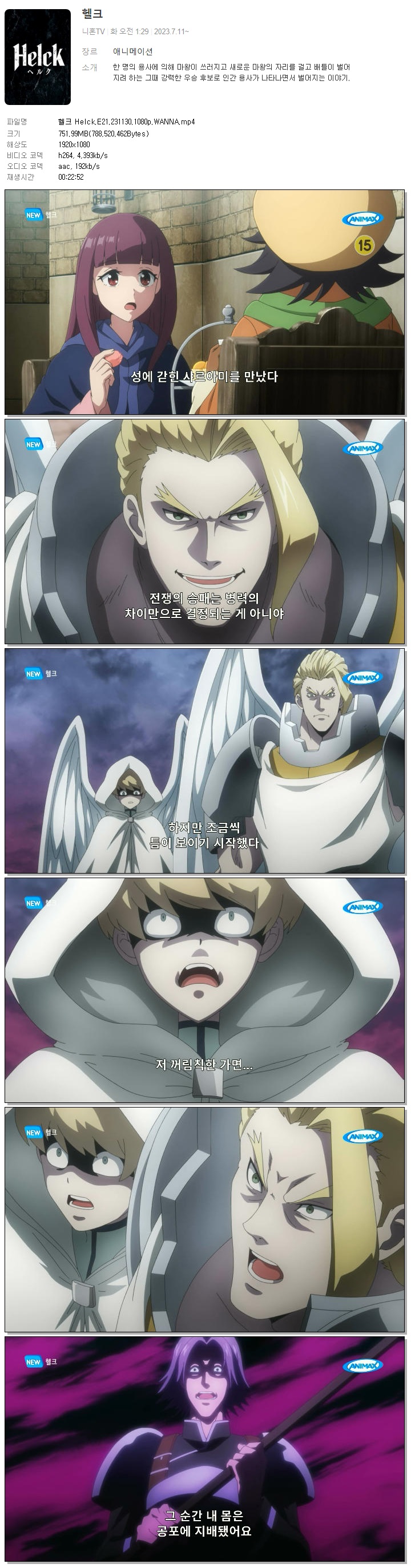 | 헬크 Helck.E21.231130.1080p.WANNA.mp4 | 752 M | 00:22:52 | 1920x1080 |