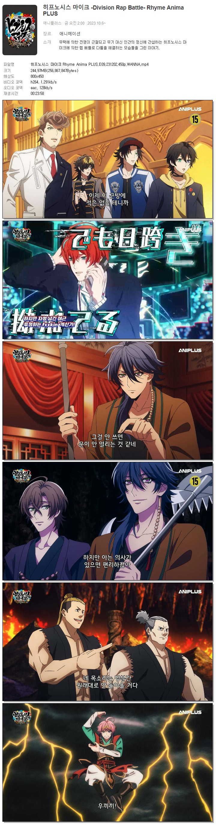 | 히프노시스 마이크 Rhyme Anima PLUS.E09.231202.450p.WANNA.mp4 | 245 M | 00:23:58 | 800x450 |