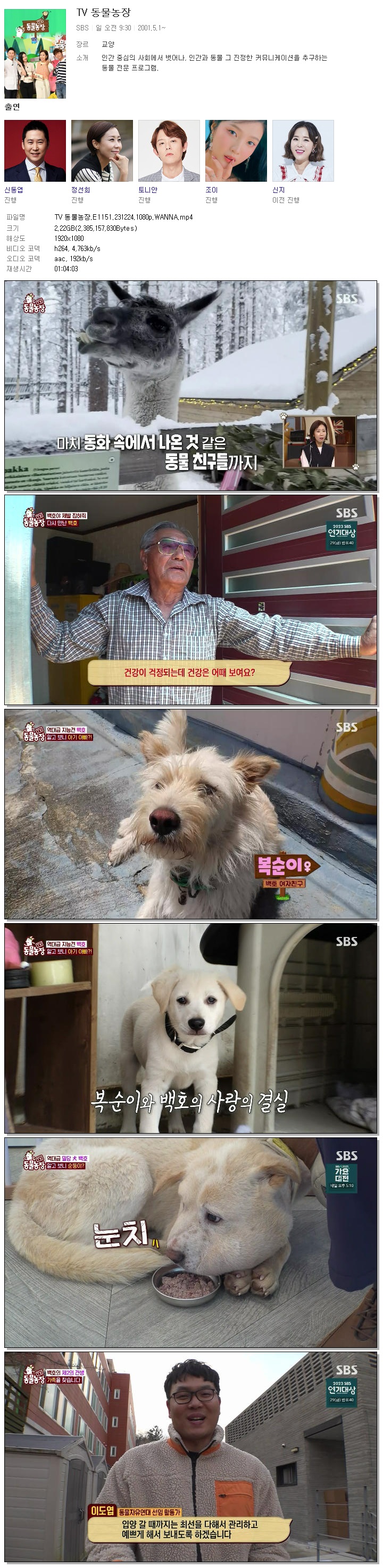 | TV 동물농장.E1151.231224.1080p.WANNA.mp4 | 2.2 G | 01:04:03 | 1920x1080 |