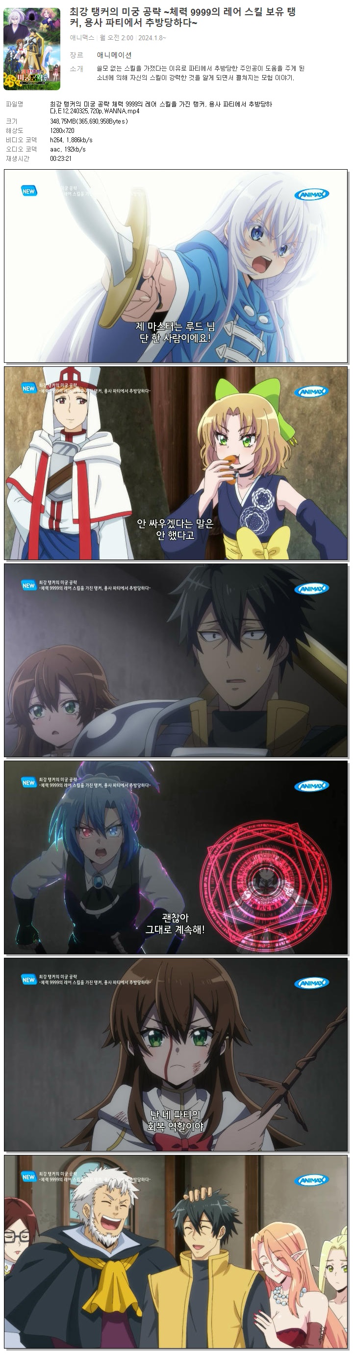 | 최강 탱커의 미궁 공략 체력 9999의 레어 스킬을 가진 탱커, 용사 파티에서 추방당하다.E12.240325.720p.WANNA.mp4 | 348.8 M | 00:23:21 | 1280x720 |