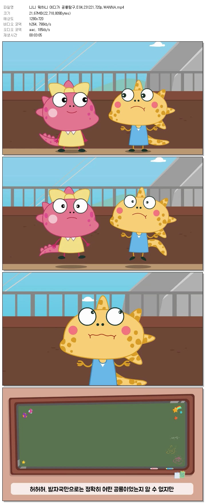 | 니니 뭐하니 어디가 공룡탐구.E04.231221.720p.WANNA.mp4 | 21.7 M | 00:03:05 | 1280x720 |