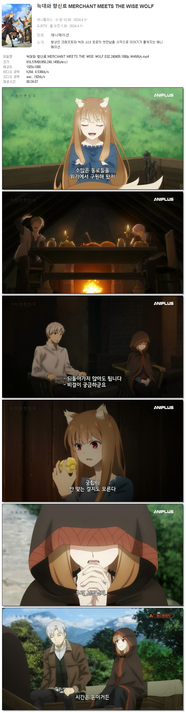 | 늑대와 향신료 MERCHANT MEETS THE WISE WOLF.E02.240409.1080p.WANNA.mp4 | 816.6 M | 00:24:07 | 1920x1080 |