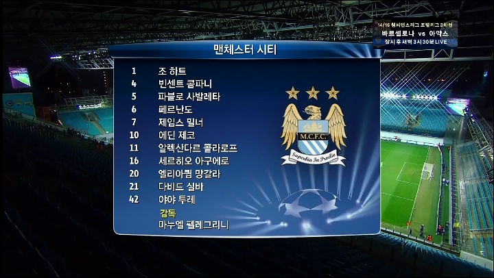 | [SPOTV] 2014-2015 챔피언스리그 조별리그 3차전 CSKA 모스크바 vs 맨체스터 시티.141022.HDTV.H264.720p-Live.avi | 2.4 G | - | 1280x720 |