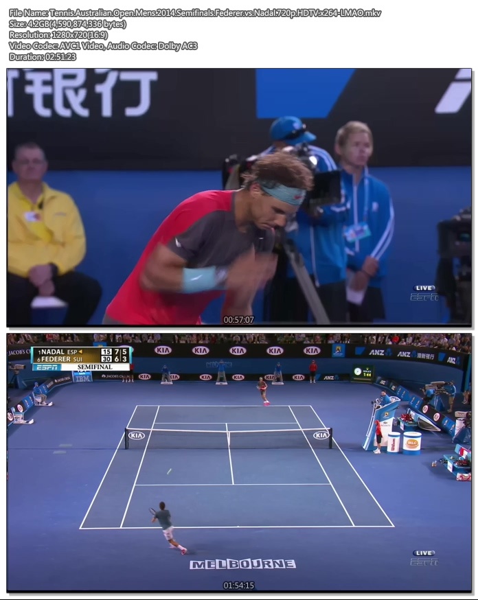 | Tennis.Australian.Open.Mens.2014.Semifinals.Federer.vs.Nadal.720p.HDTV.x264-LMAO.mkv | 4.3 G | - | 1280x720 |