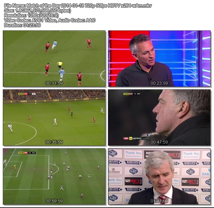| Match of the Day 2014-01-18 720p 50fps HDTV x264-wAm.mkv | 1.8 G | - | 1280x720 |