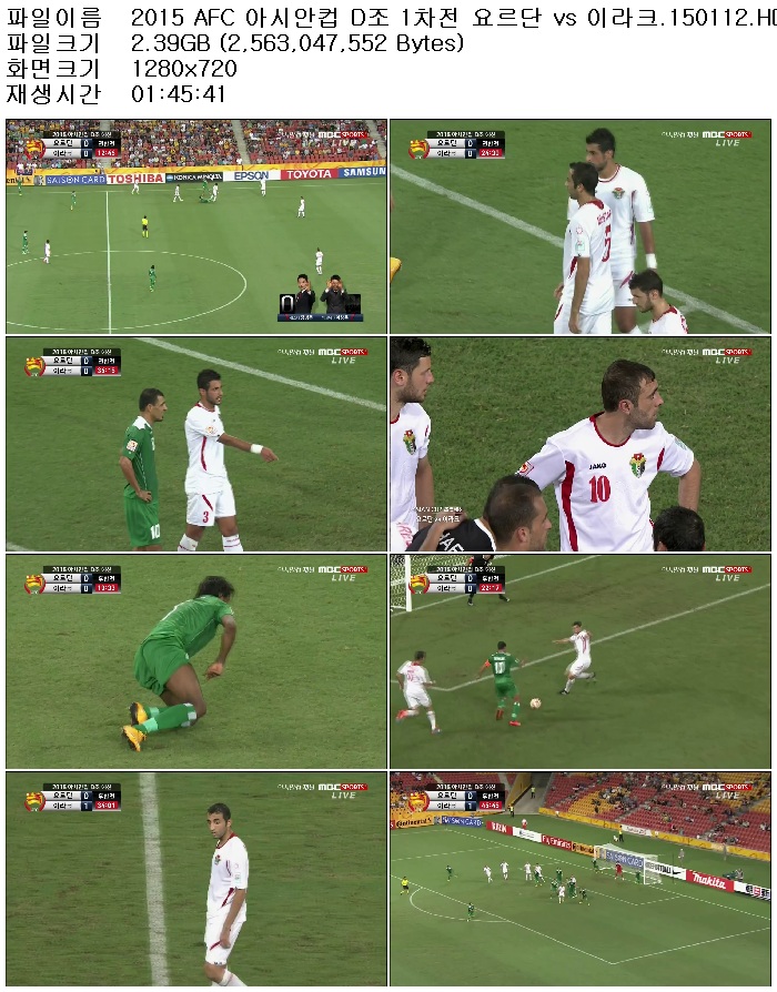 | 2015 AFC 아시안컵 D조 1차전 요르단 vs 이라크.150112.HDTV.H264.720p-Live.avi | 2.4 G | - | 1280x720 |