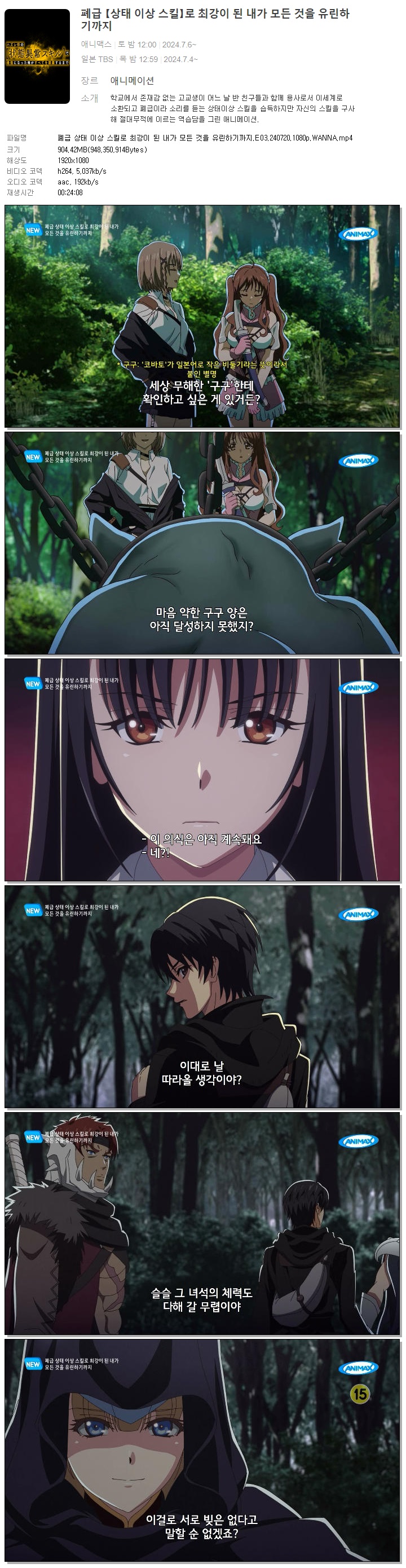 | 폐급 상태 이상 스킬로 최강이 된 내가 모든 것을 유린하기까지.E03.240720.1080p.WANNA.mp4 | 904.4 M | 00:24:08 | 1920x1080 |