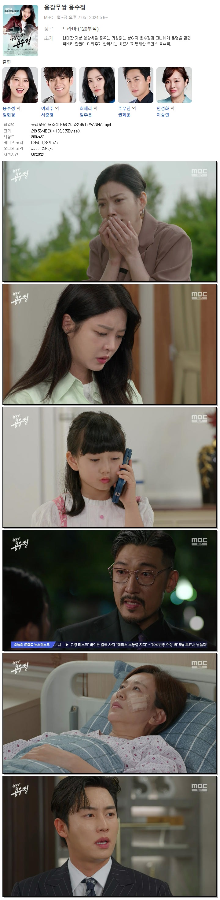 | 용감무쌍 용수정.E56.240722.450p.WANNA.mp4 | 299.6 M | 00:29:24 | 800x450 |