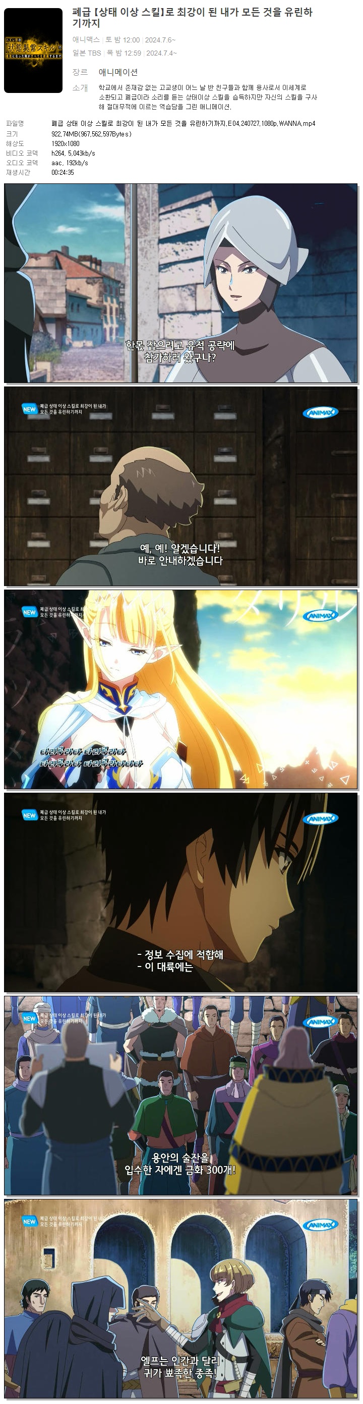 | 폐급 상태 이상 스킬로 최강이 된 내가 모든 것을 유린하기까지.E04.240727.1080p.WANNA.mp4 | 922.7 M | 00:24:35 | 1920x1080 |