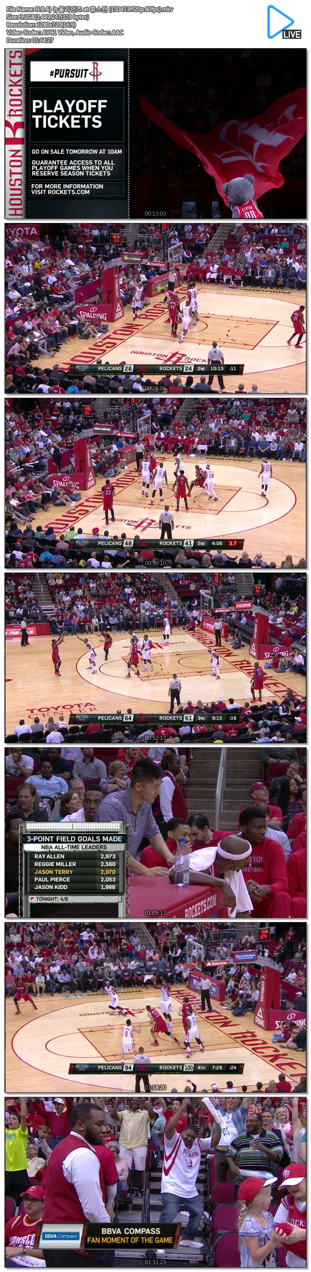 | N.B.A] 뉴올리언즈 at 휴스턴 (150413.720p.60fps).mkv | 3.2 G | - | 1280x720 |