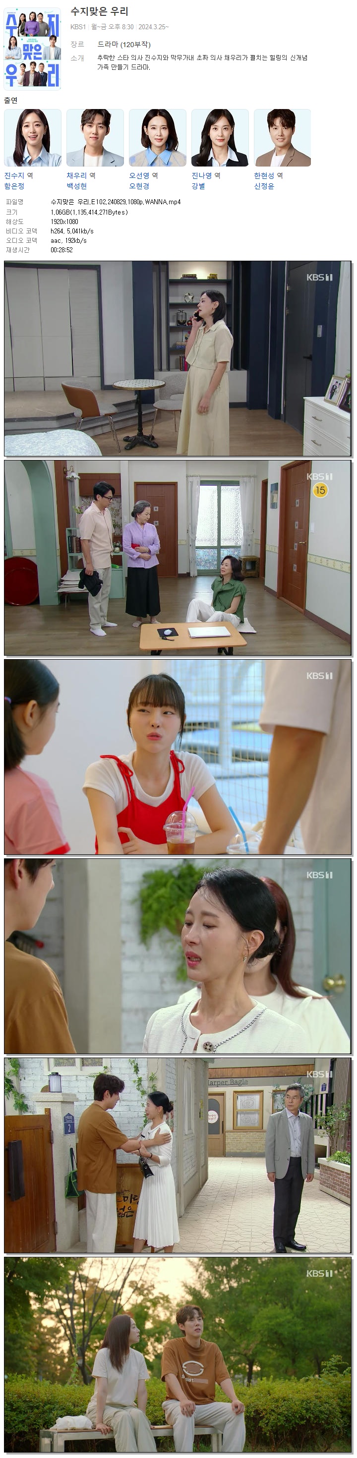 | 수지맞은 우리.E102.240829.1080p.WANNA.mp4 | 1.1 G | 00:28:52 | 1920x1080 |