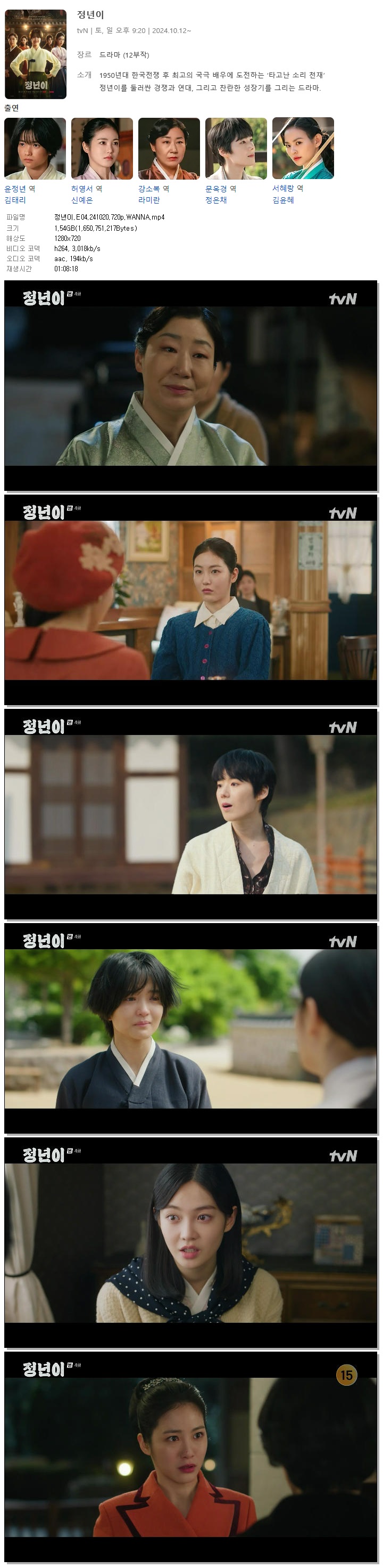| 정년이.E04.241020.720p.WANNA.mp4 | 1.5 G | 01:08:18 | 1280x720 |