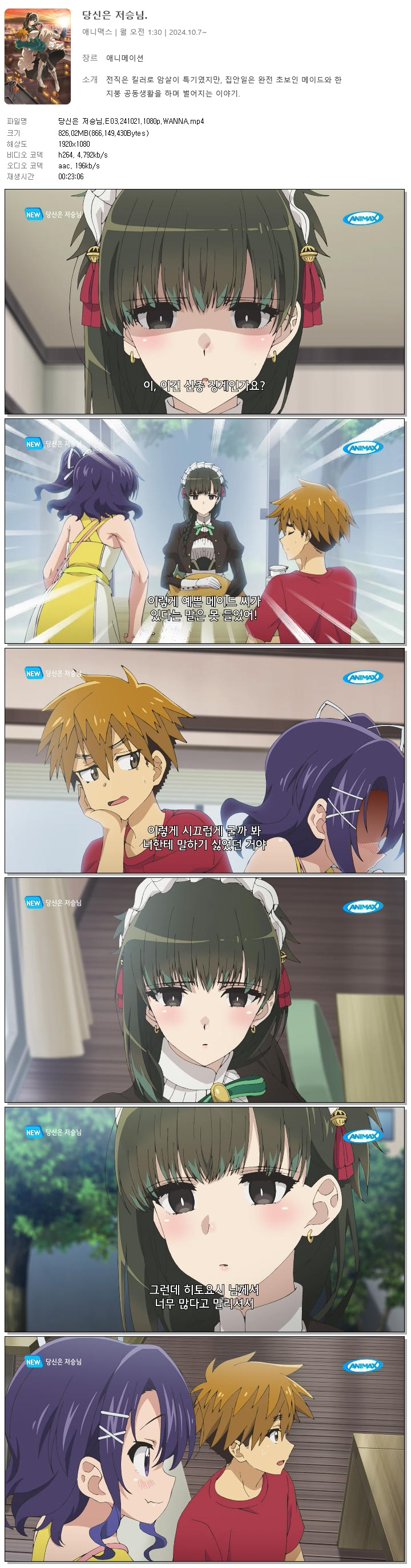 | 당신은 저승님.E03.241021.1080p.WANNA.mp4 | 826 M | 00:23:06 | 1920x1080 |