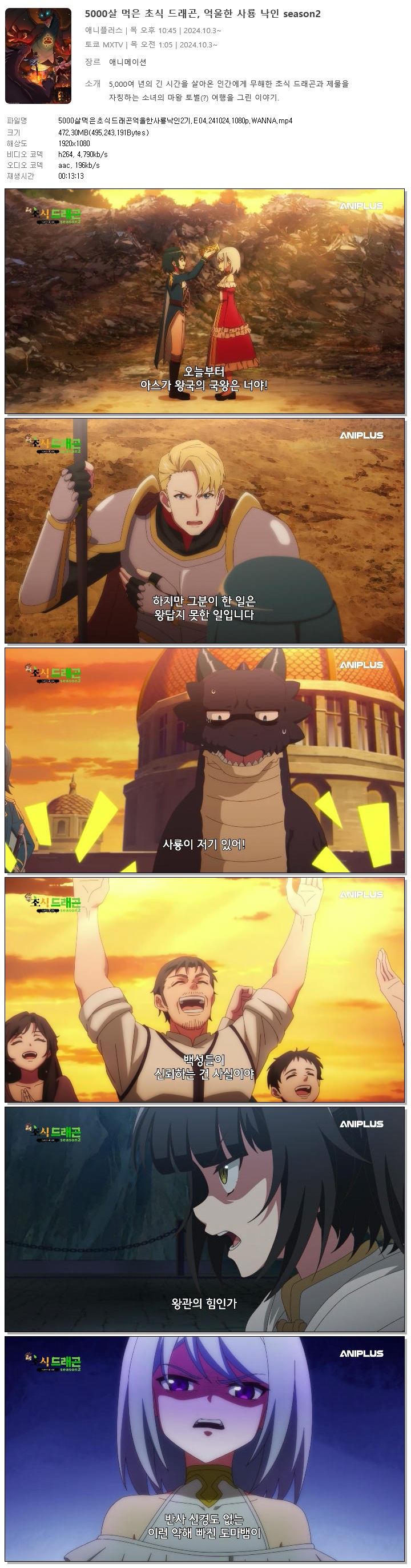 | 5000살먹은초식드래곤억울한사룡낙인2기.E04.241024.1080p.WANNA.mp4 | 472.3 M | 00:13:13 | 1920x1080 |