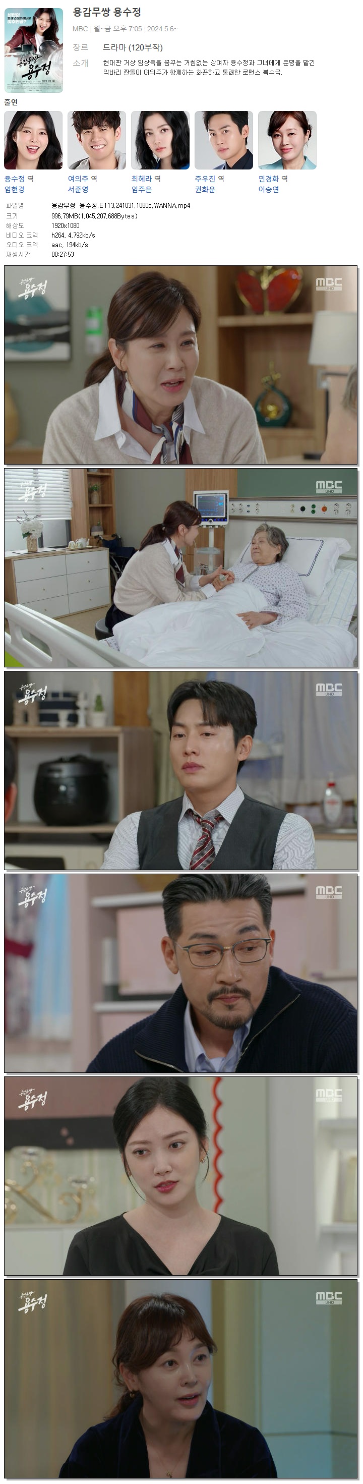 [MBC] 용감무쌍 용수정.E113.241031.1080p.WANNA[엄현경, 서준영].mp4 996.8 M 00:27:53 1920x1080