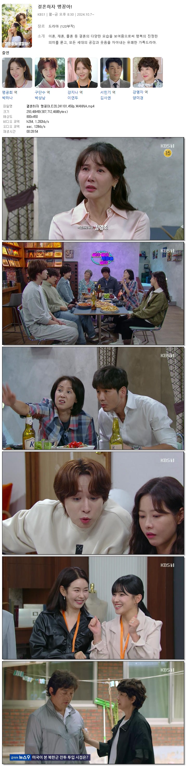 [KBS1] 결혼하자 맹꽁아.E20.241101.450p.WANNA[박하나, 박상남].mp4 293.5 M 00:28:54 800x450