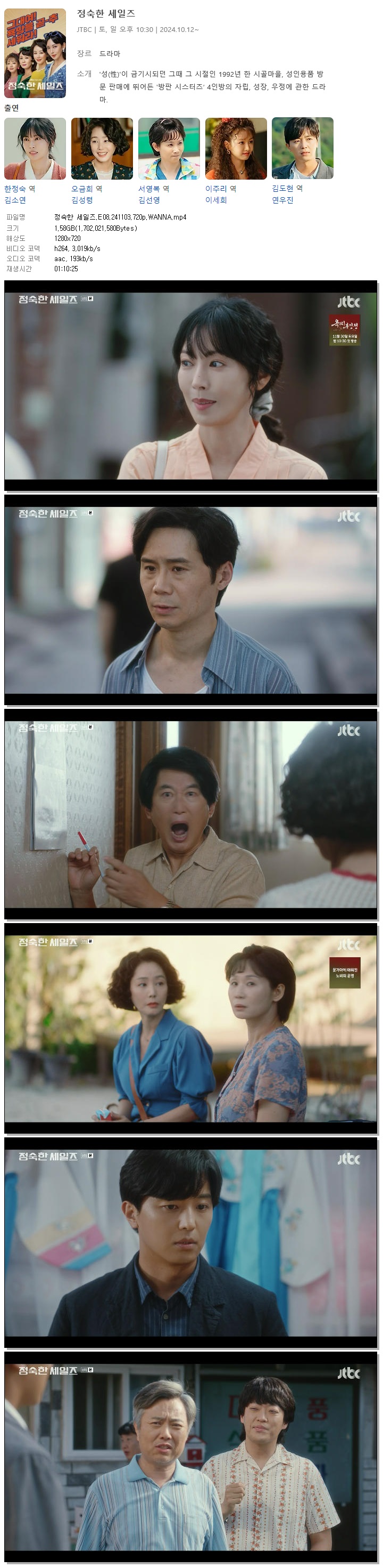| [JTBC] 정숙한 세일즈.E08.241103.720p.WANNA[김소연, 김성령].mp4 | 1.6 G | 01:10:25 | 1280x720 |