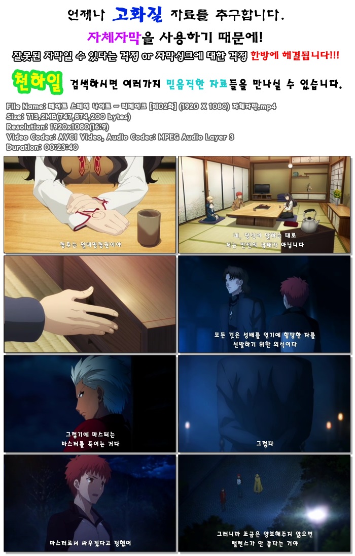 [천하일] [페이트 스테이 나이트-리메이크].02화, 1080p 초고화질 자체자막 fate stay night 2기 다시보기 토렌트