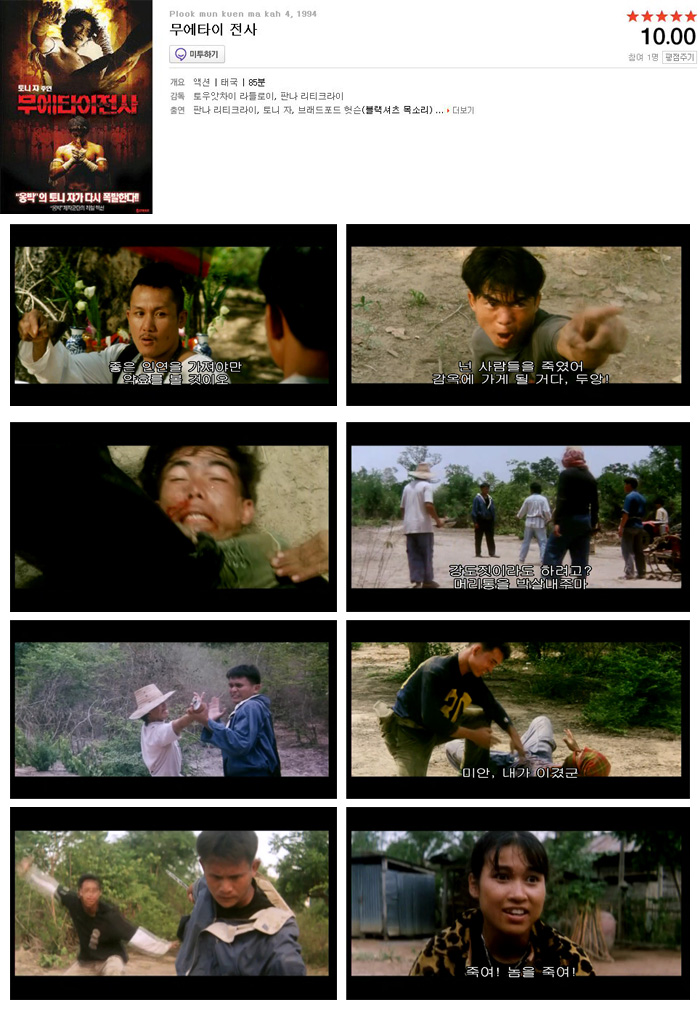 | 무에타이 전사 (Plook mun kuen ma kah 4) 감독 : 푼나 리티크라이 배우 : 토니 자 태국의 시골 사이당이라는 마을 근처에 의술을 행하는 두앙이란 자가 무지한 사람들에게 영생의 약을 먹이다가 주민이 죽자 입을 막기 위해 다른 사람들도 살해한다. 간신히 목숨을 건진 한 사람이 마을에 알려 주민들이 합세해 두앙은 칼을 맞고 강물로 떨어진다. 그로부터 5년 후, 마을 숲에 무에타이에 능하고 온갖 무기를 다룰 줄 아는 남자가 나타나 숲으로 들어오는 사람들을 이유 없이 죽이는 일이 일어난다. 또한 사이당 마을의 유물을 찾아온 일본인 관광객 일행과 보물을 노리고 들어온 중국인 무리들이 숲 속의 남자에게 차례로 살해당하자 마을 촌장과 젊은이들은 힘을 합쳐 대적에 나서는데... 남자는 5년 전 죽은 것으로 알려진 두앙이 돌아와 마을 사람들에게 복수하기 위해 자신의 신통술로 만든 무적의 좀비인간, 과연 그를 없앨 수 있을까?! |
