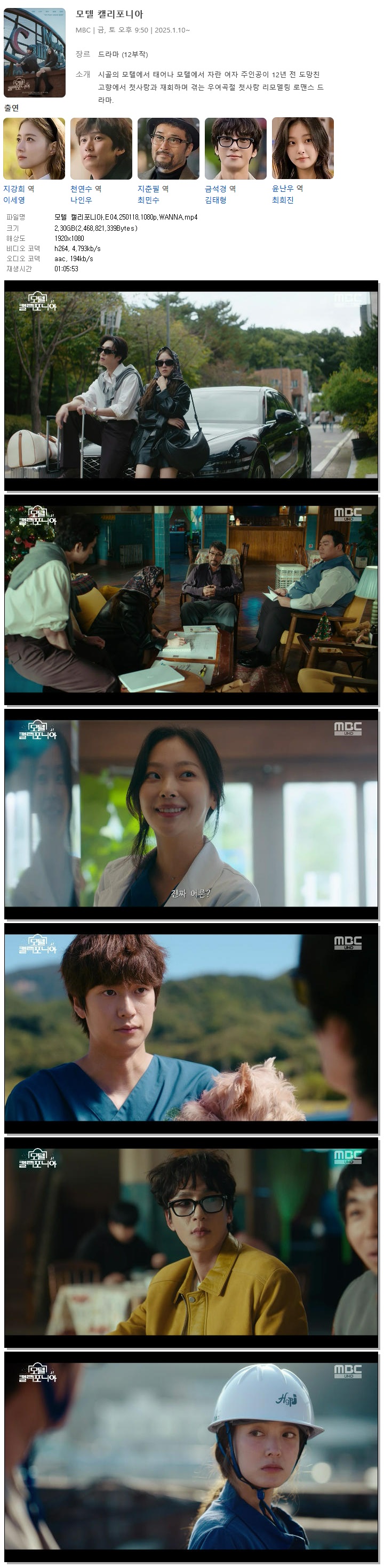 [MBC] 모텔 캘리포니아.E04.250118.1080p.WANNA[이세영, 나인우].mp4 2.3 G 01:05:53 1920x1080