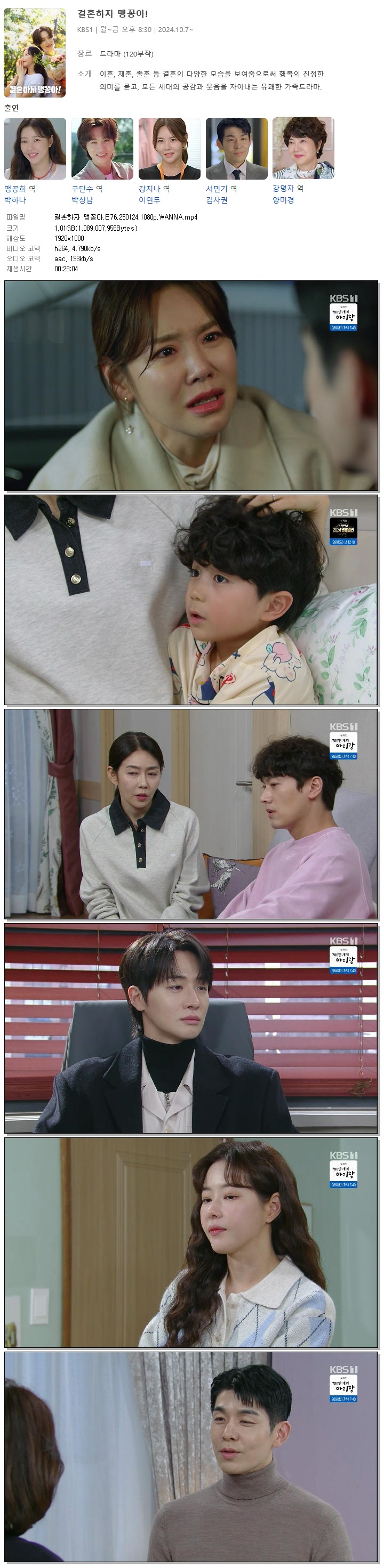 [KBS1] 결혼하자 맹꽁아.E76.250124.1080p.WANNA[박하나, 박상남].mp4 1 G 00:29:04 1920x1080