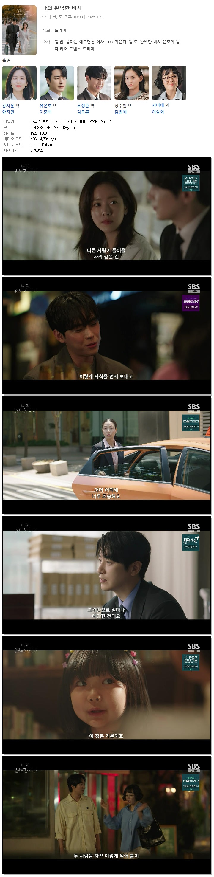 | [SBS] 나의 완벽한 비서.E08.250125.1080p.WANNA[한지민, 이준혁].mp4 | 2.4 G | 01:08:25 | 1920x1080 |