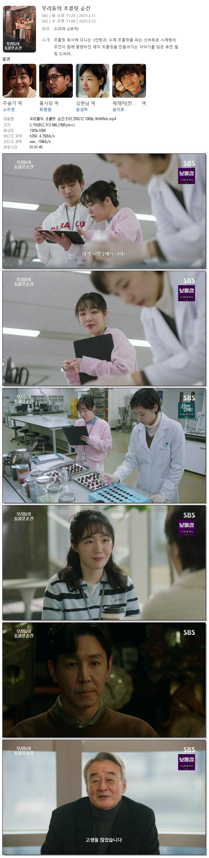 | [SBS] 우리들의 초콜릿 순간.E02.250212.1080p.WANNA[소주연, 최원영].mp4 | 2.2 G | 01:01:45 | 1920x1080 |