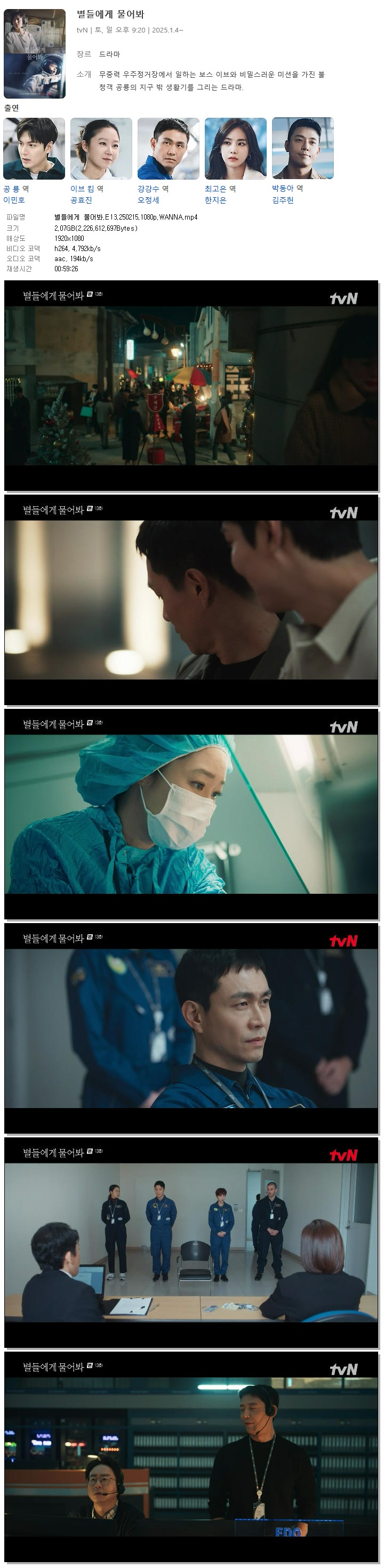 | [TVN] 별들에게 물어봐.E13.250215.1080p.WANNA[이민호, 공효진].mp4 | 2.1 G | 00:59:26 | 1920x1080 |