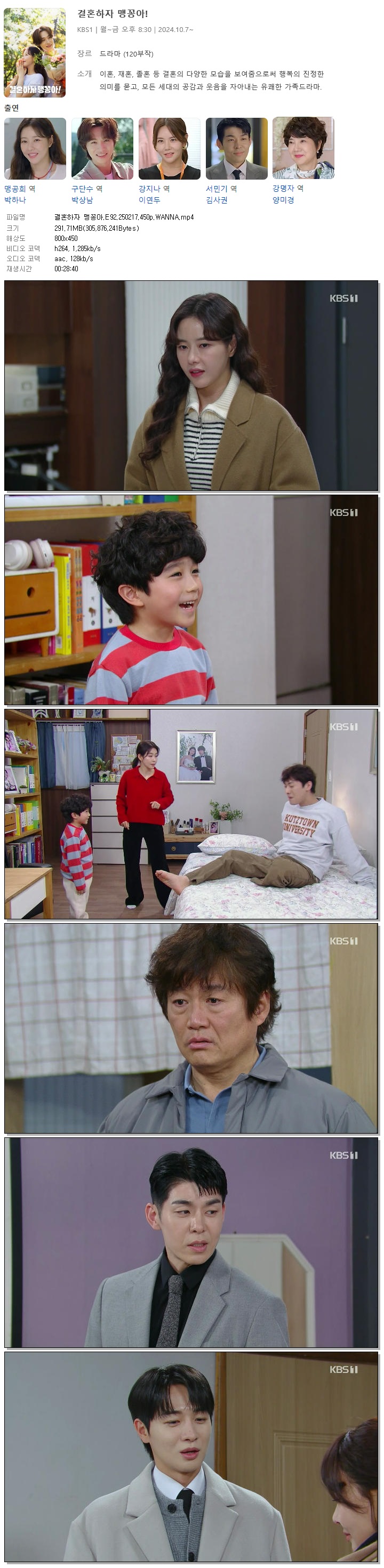 | [KBS1] 결혼하자 맹꽁아.E92.250217.450p.WANNA[박하나, 박상남].mp4 | 291.7 M | 00:28:40 | 800x450 |
