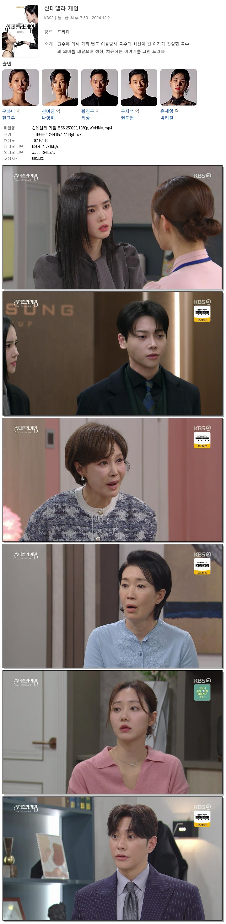 | [KBS2] 신데렐라 게임.E56.250220.1080p.WANNA[한그루, 나영희].mp4 | 1.2 G | 00:33:21 | 1920x1080 |