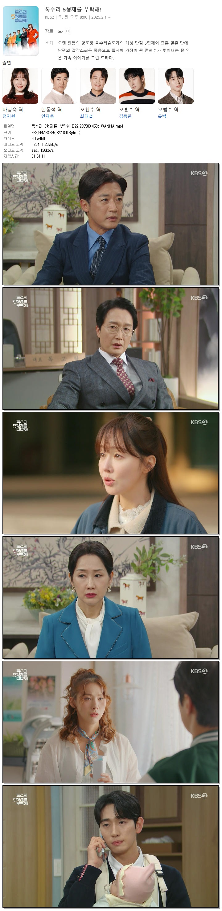 | [KBS2] 독수리 5형제를 부탁해.E27.250503.450p.WANNA[엄지원, 안재욱].mp4 | 654 M | 01:04:11 | 800x450 |
