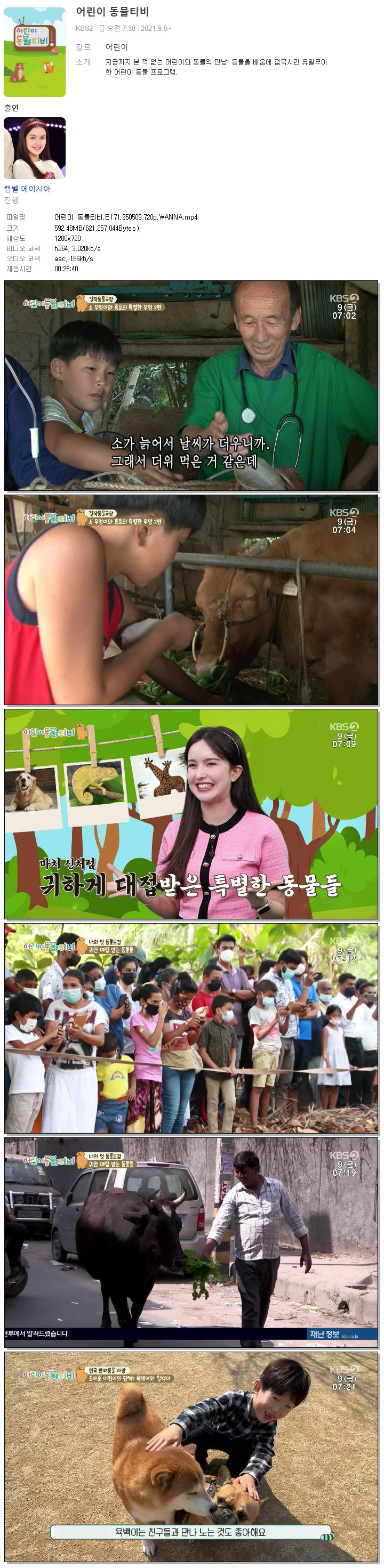 | [KBS2] 어린이 동물티비.E171.250509.720p.WANNA[캠벨 에이시아].mp4 | 592.5 M | 00:25:40 | 1280x720 |