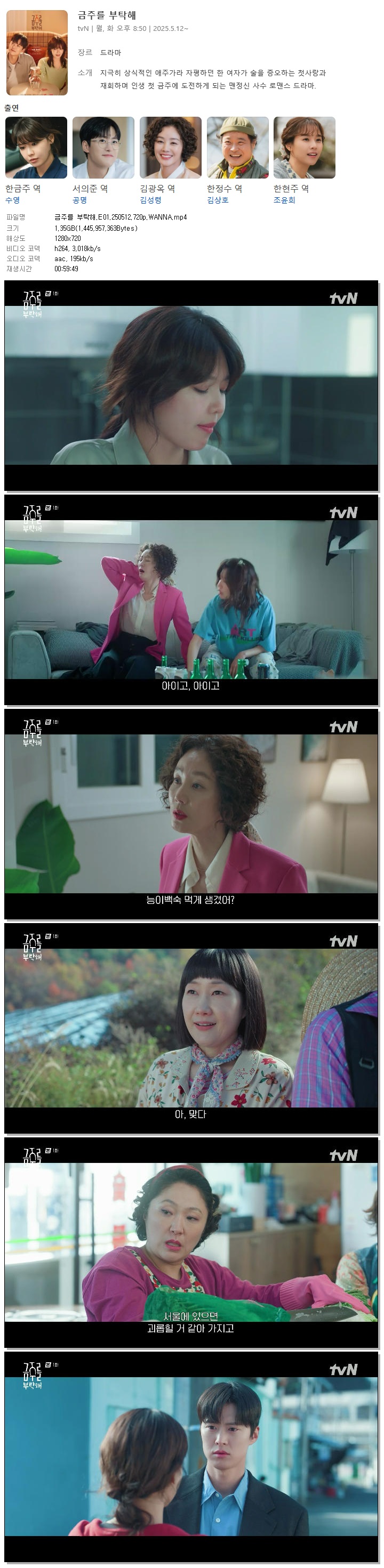 [TVN] 금주를 부탁해.E01.250512.720p.WANNA[최수영, 공명].mp4 1.3 G 00:59:49 1280x720