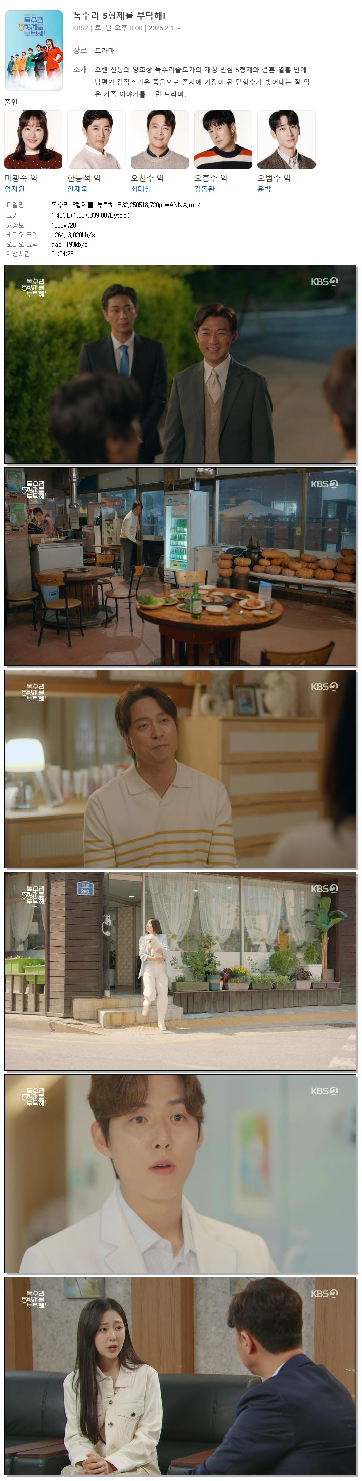 | [KBS2] 독수리 5형제를 부탁해.E32.250518.720p.WANNA[엄지원, 안재욱].mp4 | 1.5 G | 01:04:26 | 1280x720 |