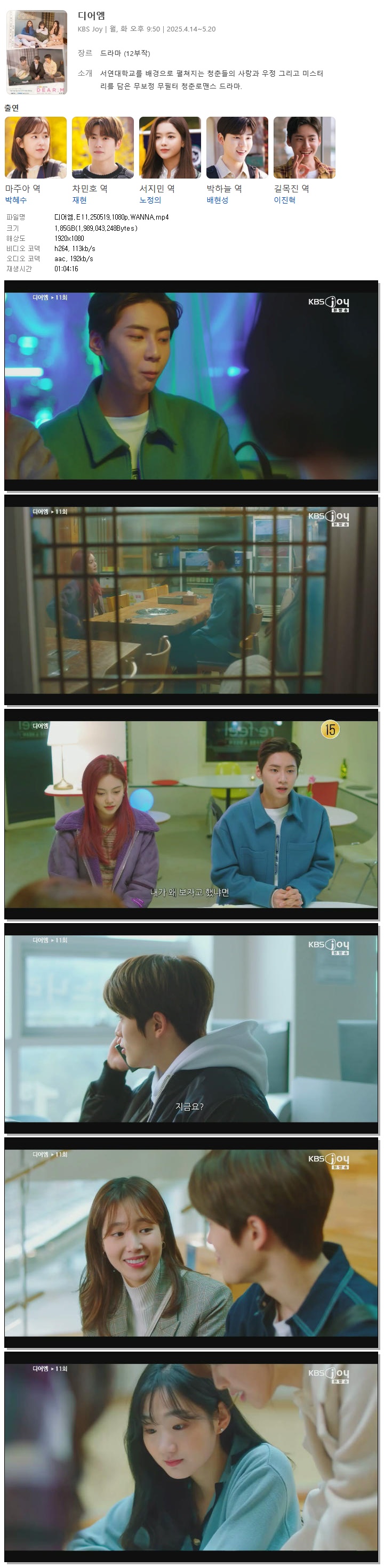[KBS JOY] 디어엠.E11.250519.1080p.WANNA[박혜수, 재현].mp4 1.9 G 01:04:16 1920x1080