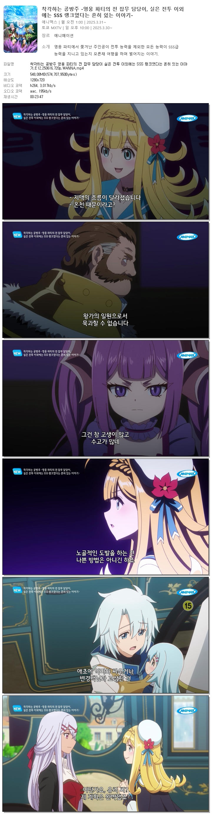 | 착각하는 공방주 영웅 파티의 전 잡무 담당이 실은 전투 이외에는 SSS 랭크였다는 흔히 있는 이야기.E12.250616.720p.WANNA.mp4 | 548.1 M | 00:23:47 | 1280x720 |