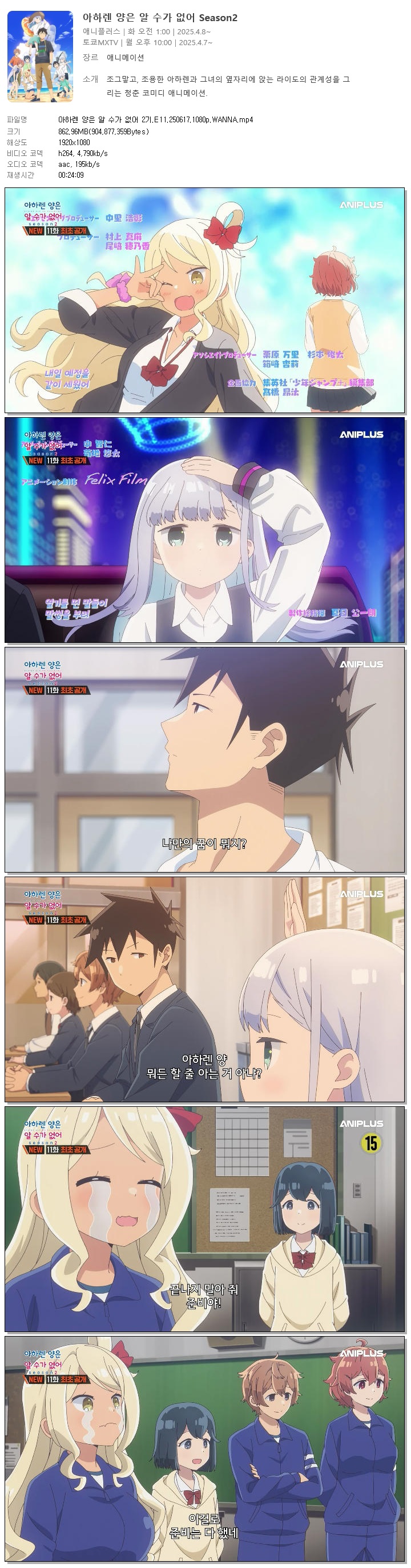 | 아하렌 양은 알 수가 없어 2기.E11.250617.1080p.WANNA.mp4 | 863 M | 00:24:09 | 1920x1080 |