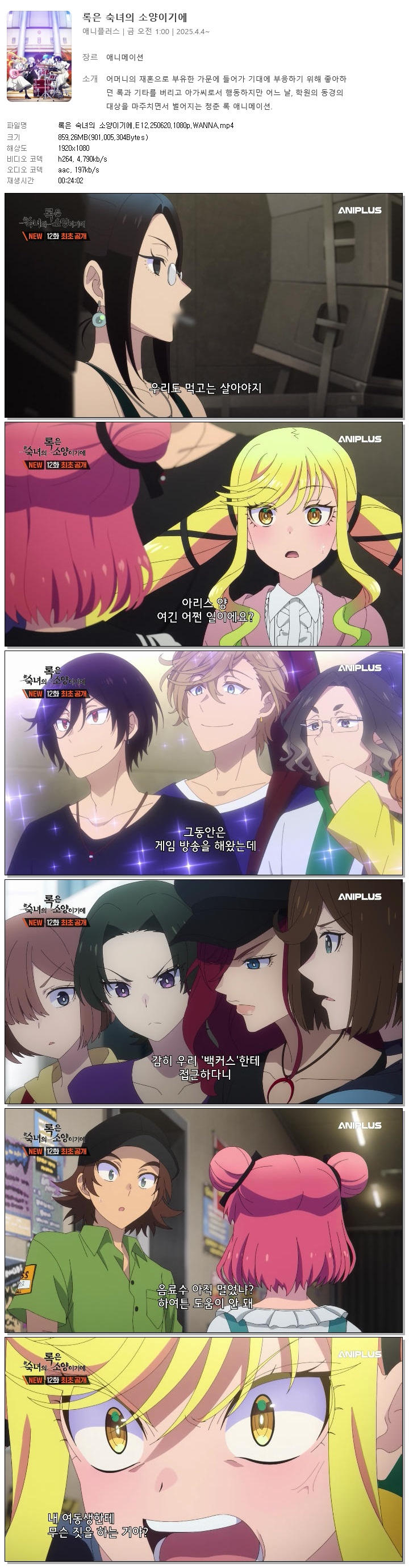 | 록은 숙녀의 소양이기에.E12.250620.1080p.WANNA.mp4 | 859.3 M | 00:24:02 | 1920x1080 |