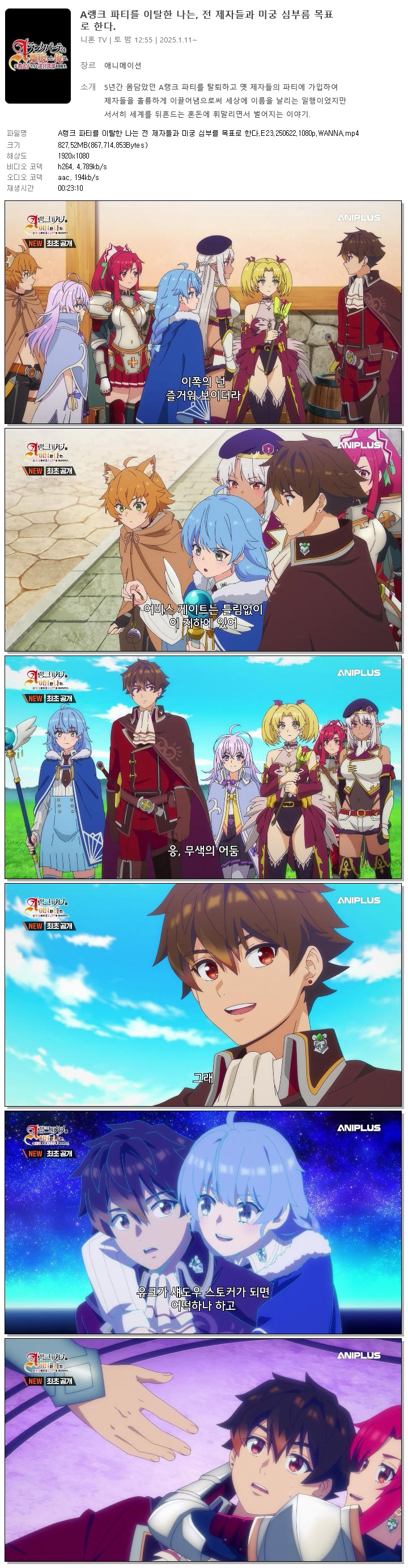 | A랭크 파티를 이탈한 나는 전 제자들과 미궁 심부를 목표로 한다.E23.250622.1080p.WANNA.mp4 | 827.5 M | 00:23:10 | 1920x1080 |