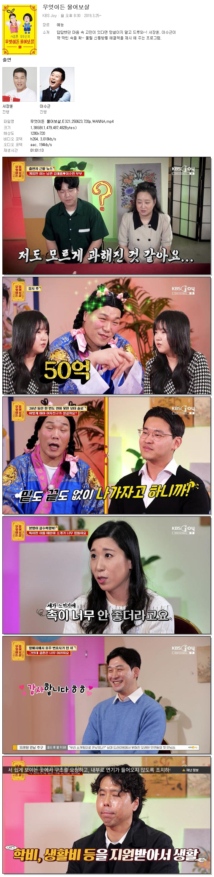 | [KBS JOY] 무엇이든 물어보살.E321.250623.720p.WANNA[서장훈, 이수근].mp4 | 1.4 G | 01:01:13 | 1280x720 |