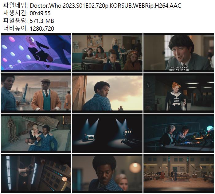 | Doctor.Who.2023.S01E02.720p.KORSUB.WEBRip.H264.AAC.mp4 | 571.3 M | 00:49:55 | 1280x720 |