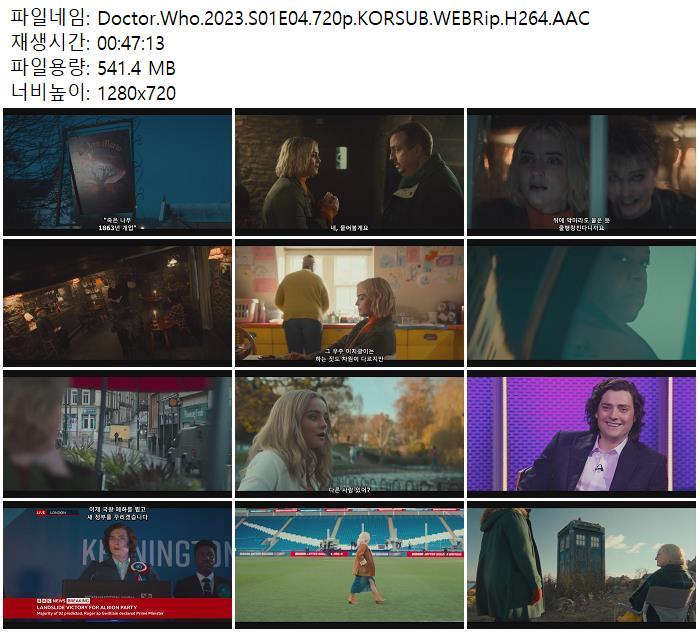 | Doctor.Who.2023.S01E04.720p.KORSUB.WEBRip.H264.AAC.mp4 | 541.4 M | 00:47:13 | 1280x720 |